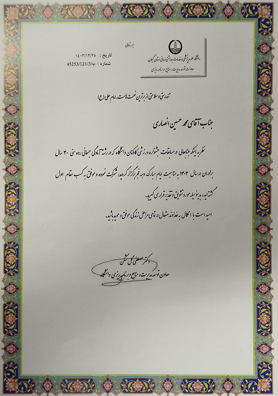 بر اساس این گزارش، محمد حسین انصاری حفاظت فیزیکی مرکز آموزشی و درمانی ولایت، عضو تیم حراست دانشگاه، در رقابت‌های گروه سنی زیر ۳۵ سال با اقتدار به مقام قهرمانی دست یافت و مدال طلای این دوره از مسابقات را بر گردن آویخت.