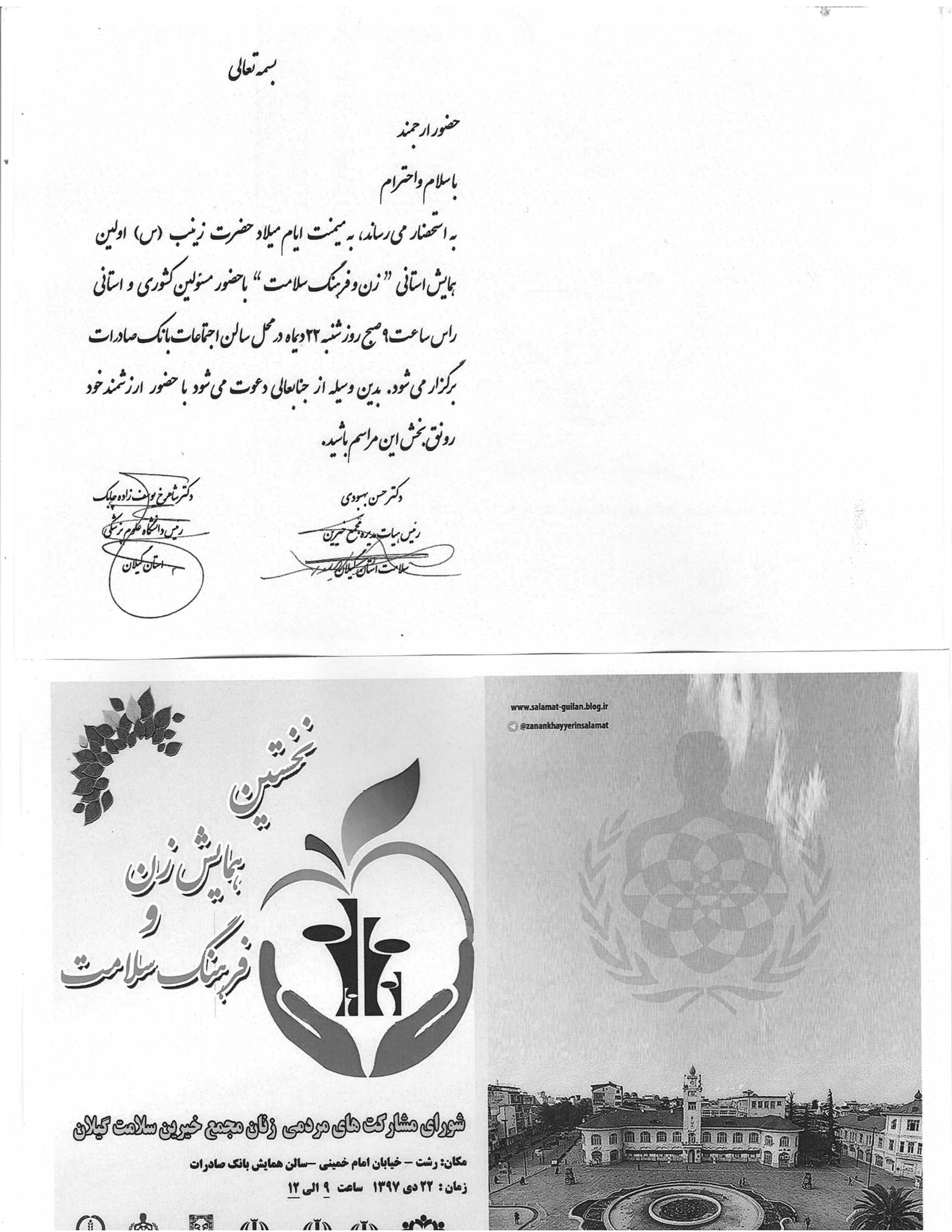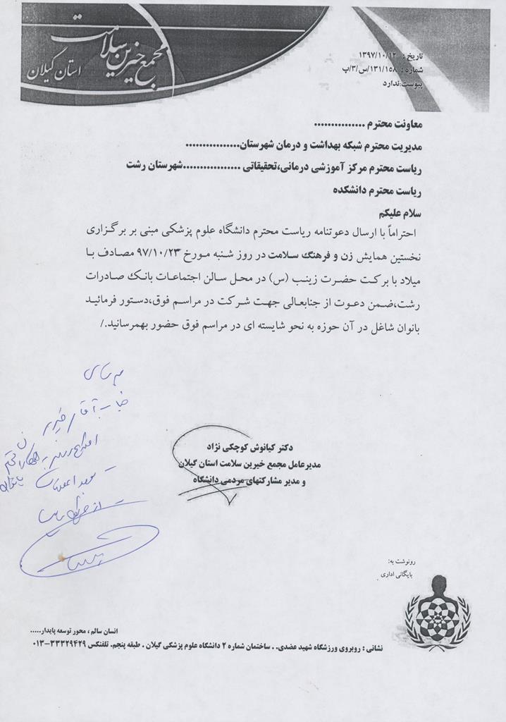 احتراما با ارسال دعوتنامه ریاست محترم دانشگاه علوم پزشکی گیلان مبنی بر برگزاری نخستین همایش زن و فرهنگ سلامت در روز شنبه 22 دی 97 مصادف با میلاد با برکت حضرت زینب (س) در محل سالن اجتماعات بانک صادرات رشت، ضمن دعوت از جنابعالی جهت شرکت در مراسم فوق، دستور فرمائید بانوان شاغل در آن حوزه به نحو شایسته ای در مراسم فوق حضور بهمرسانید.